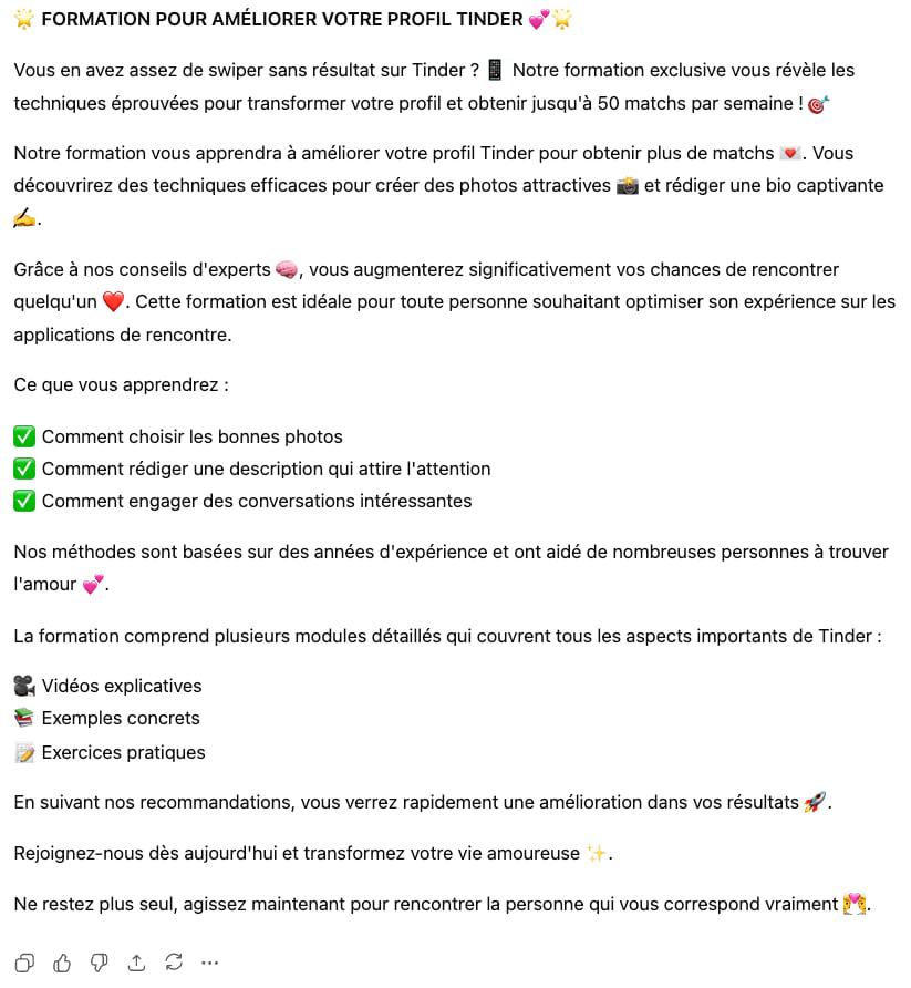 À titre d'exemple, j'ai demandé à Chat GPT d'écrire une page de vente pour une formation sur Tinder. Cette formation s'adresse à des hommes célibataires et leur permet d'obtenir jusqu'à 50 matchs par semaine.