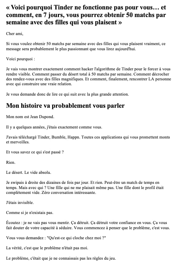 Un texte viscéral. Émotionnel. Qui vous prend aux tripes. Structuré comme une lettre personnelle. Avec des accroches. Des bénéfices concrets. Des histoires captivantes. Des preuves convaincantes. Des appels à l'action irrésistibles.